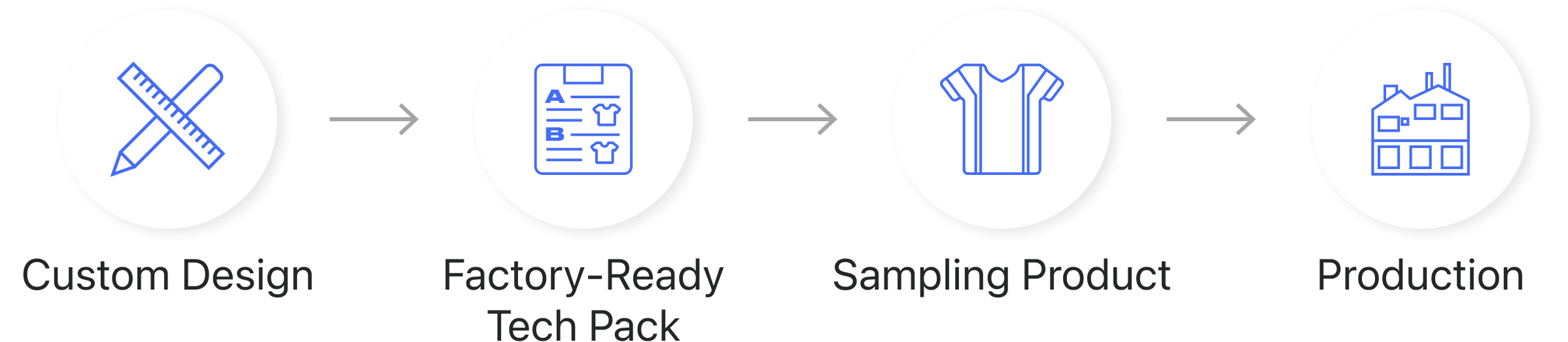 Tech pack creation takes 1 week. Sampling takes 3 weeks. Bulk production takes 6–8 weeks.